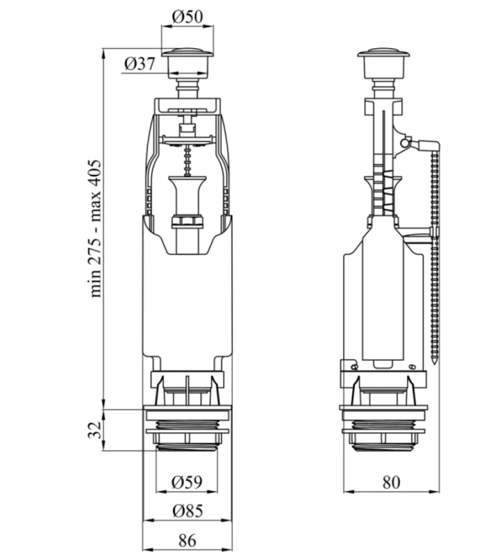 Регульована висота установки: Арматура дозволяє налаштовувати висоту встановлення в діапазоні від 275 до 405 мм, що робить її сумісною з різними моделями унітазів і забезпечує оптимальну відповідність.