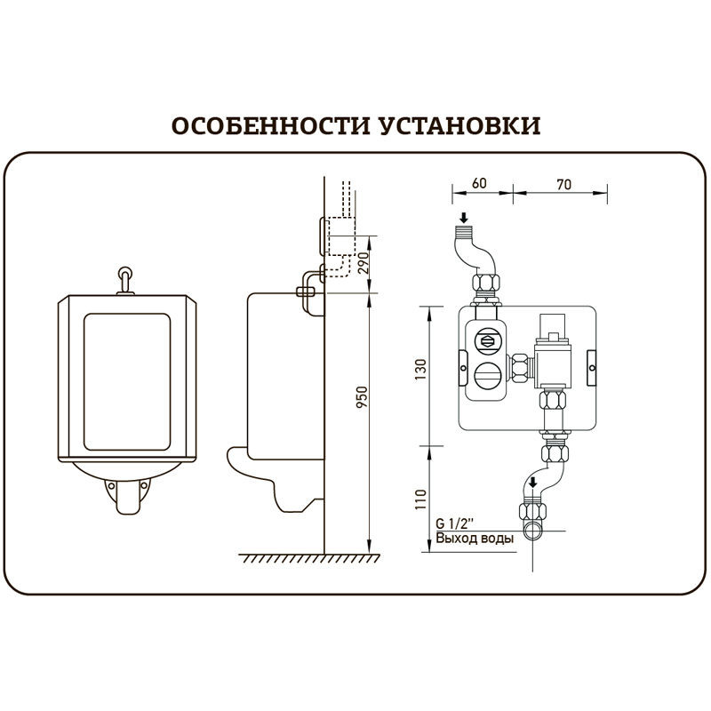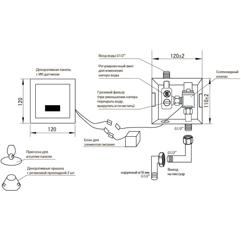 Комплектація Корпус панелі змиву, декоративна панель з ІЧ датчиком, блок для елементів живлення, редуктор для під'єднання до електричної мережі, присоска для вилучення панелі, 2 декоративні чаші з гумовими прокладками, 2 фітинги для підключення води, патрубок виходу на пісуар, інструкція з експлуатації з гарантійним талоном