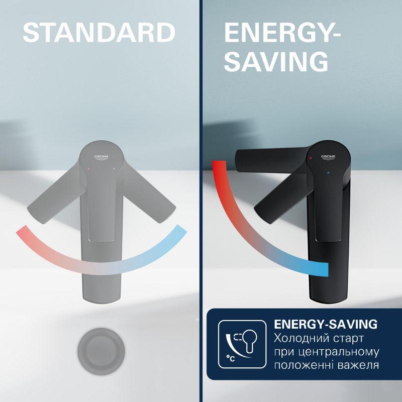 Технологія GROHE Water Saving обмежує витрату до 5 л/хв (при 3 барах), зберігаючи потужний струмінь води. Усередині змішувача працює довговічний картридж GROHE SilkMove Energy Saving, що забезпечує плавне й точне регулювання напору та температури. Функція холодного старту в середньому положенні ручки допомагає уникати зайвих витрат енергії, а вбудований обмежувач температури економить ще більше.