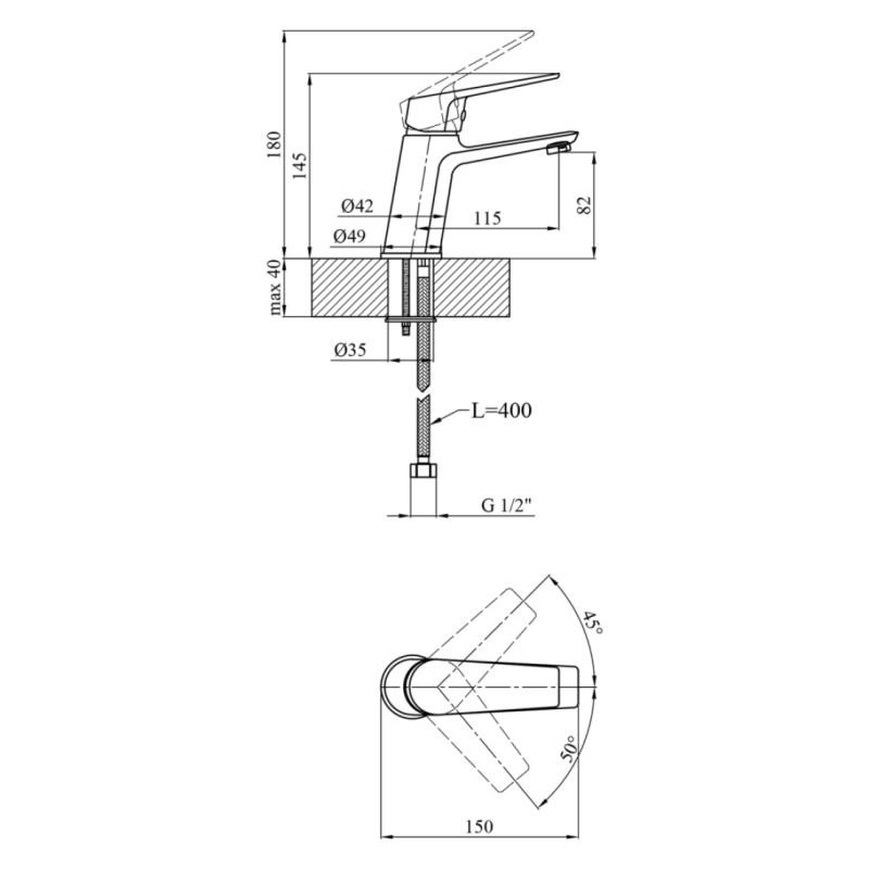 Змішувач встановлюється урізним способом за допомогою шпильки, що забезпечує надійну фіксацію. Висота виробу становить 145 мм, що робить його зручним для використання, а довжина виливу 115 мм дозволяє комфортно спрямовувати потік води. Картридж діаметром 35 мм забезпечує плавне регулювання температури та напору води.