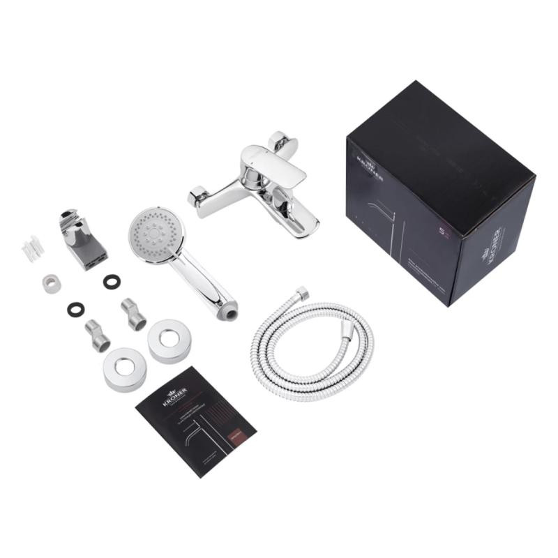 Комплектація включає всі необхідні елементи: змішувач, лійку для ручного душу, душовий шланг, кронштейн для ручного душу, кріплення та інструкцію, що дозволяє легко зібрати і встановити змішувач самостійно.