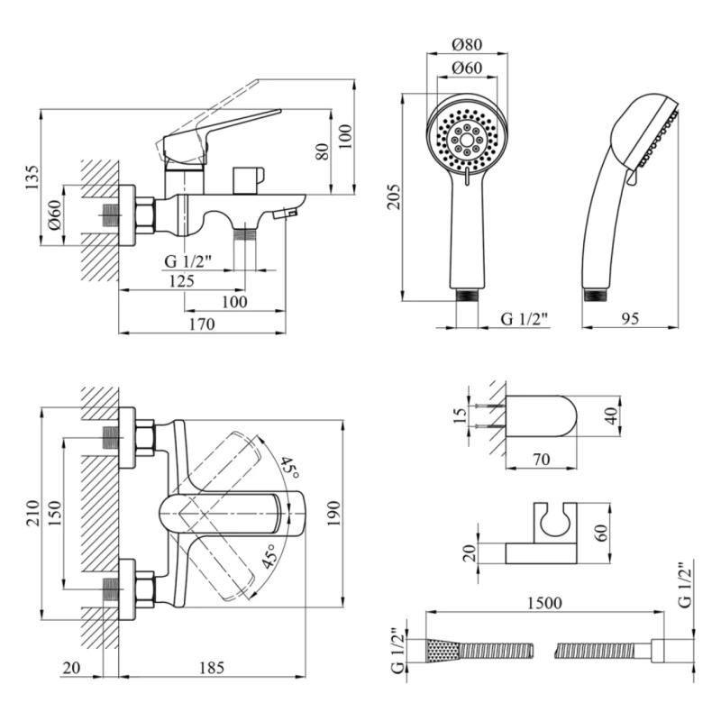 Основні характеристики включають: висота змішувача 135 мм, ширина 210 мм і глибина 185 мм, що дозволяє зручно використовувати його у ванній кімнаті. Діаметр підключення становить 1/2'', що робить цей змішувач універсальним для більшості систем. У комплекті йде кругла лійка діаметром 80 мм та душовий шланг довжиною 1500 мм, що забезпечує комфорт під час прийому душу.