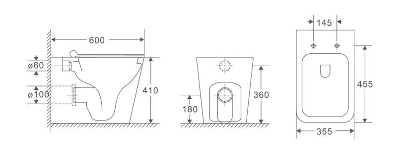 Компактные размеры 600х355х410 мм позволяют установить унитаз даже в небольших помещениях, а напольный монтаж обеспечивает стабильность и надежность конструкции.
