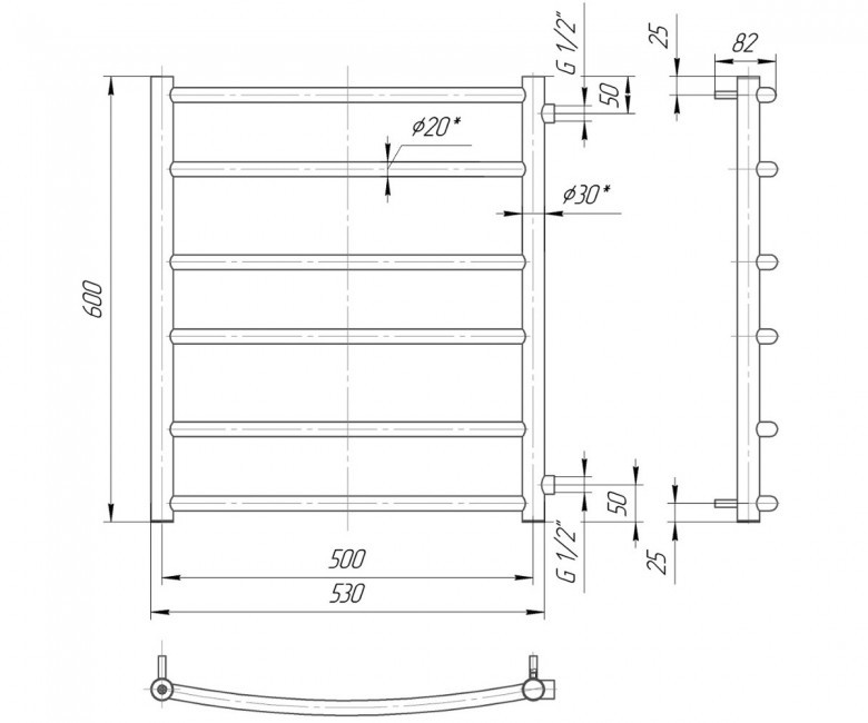 Водяной стационарный полотенцесушитель 600 х 550 мм из нержавеющей стали, боковой подвод воды с диаметром подключения G 1/2, цвет хром