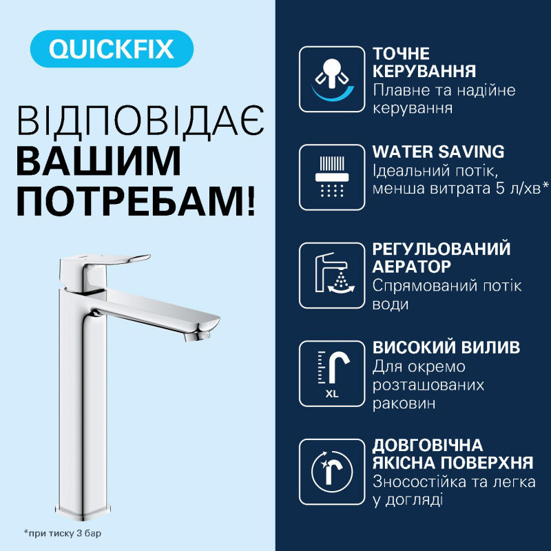 Для более бережливости применена технология GROHE Water Saving, которая снижает расход воды до 5 л/мин (при 3 барах), сохраняя мощную струю. Долговечное хромированное покрытие GROHE Long-Life надежно защищает от износа и легко очищается, позволяя смесителю оставаться безупречным на протяжении многих лет.