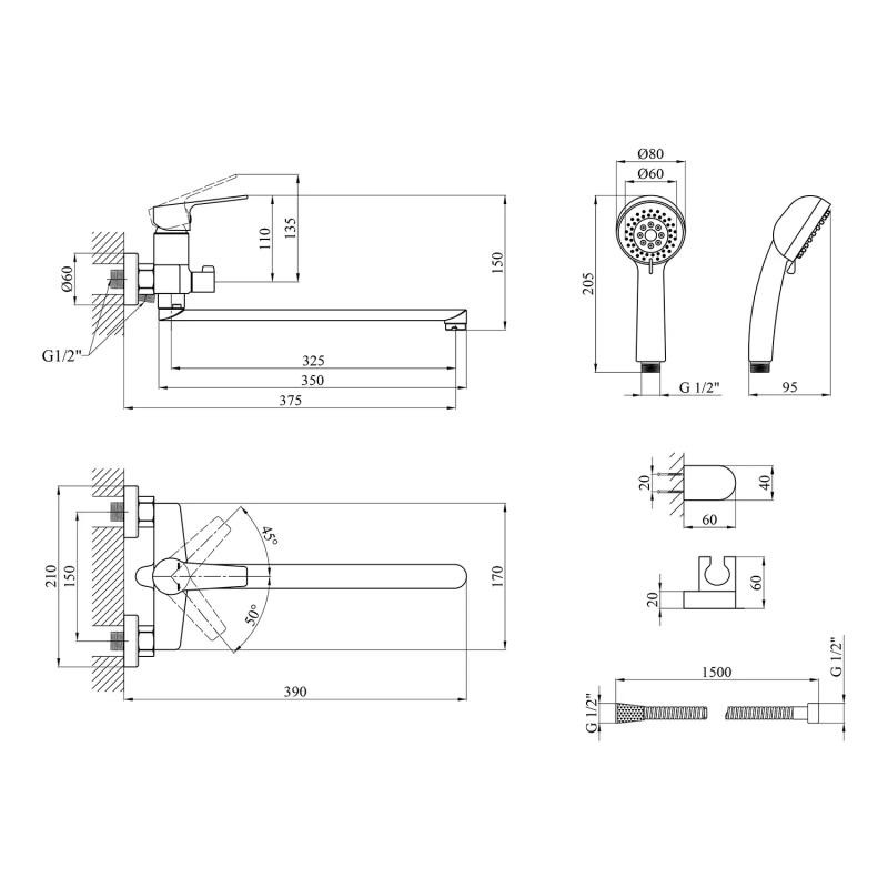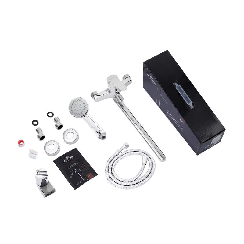 Душевой гарнитур в комплекте: Полная комплектация включает в себя душевой гарнитур, что делает смеситель универсальным решением для ванны и душа.
